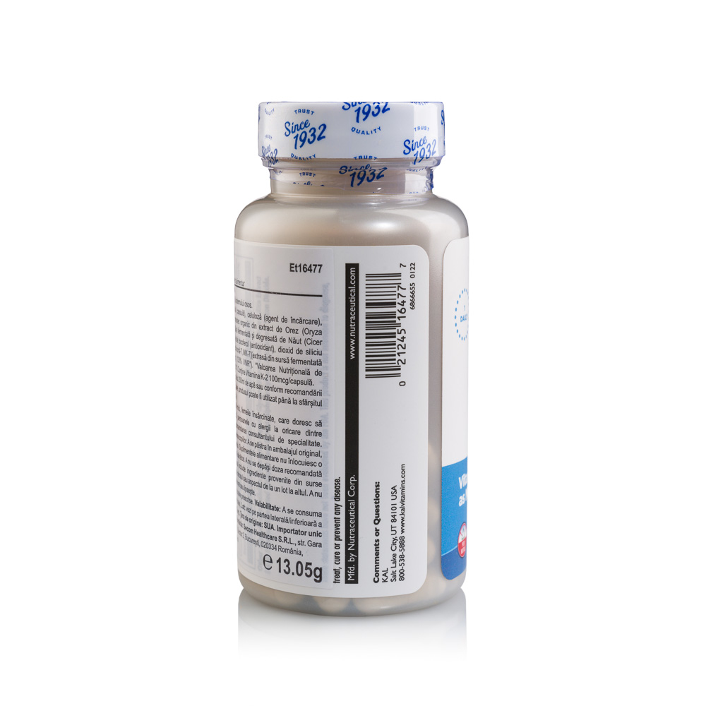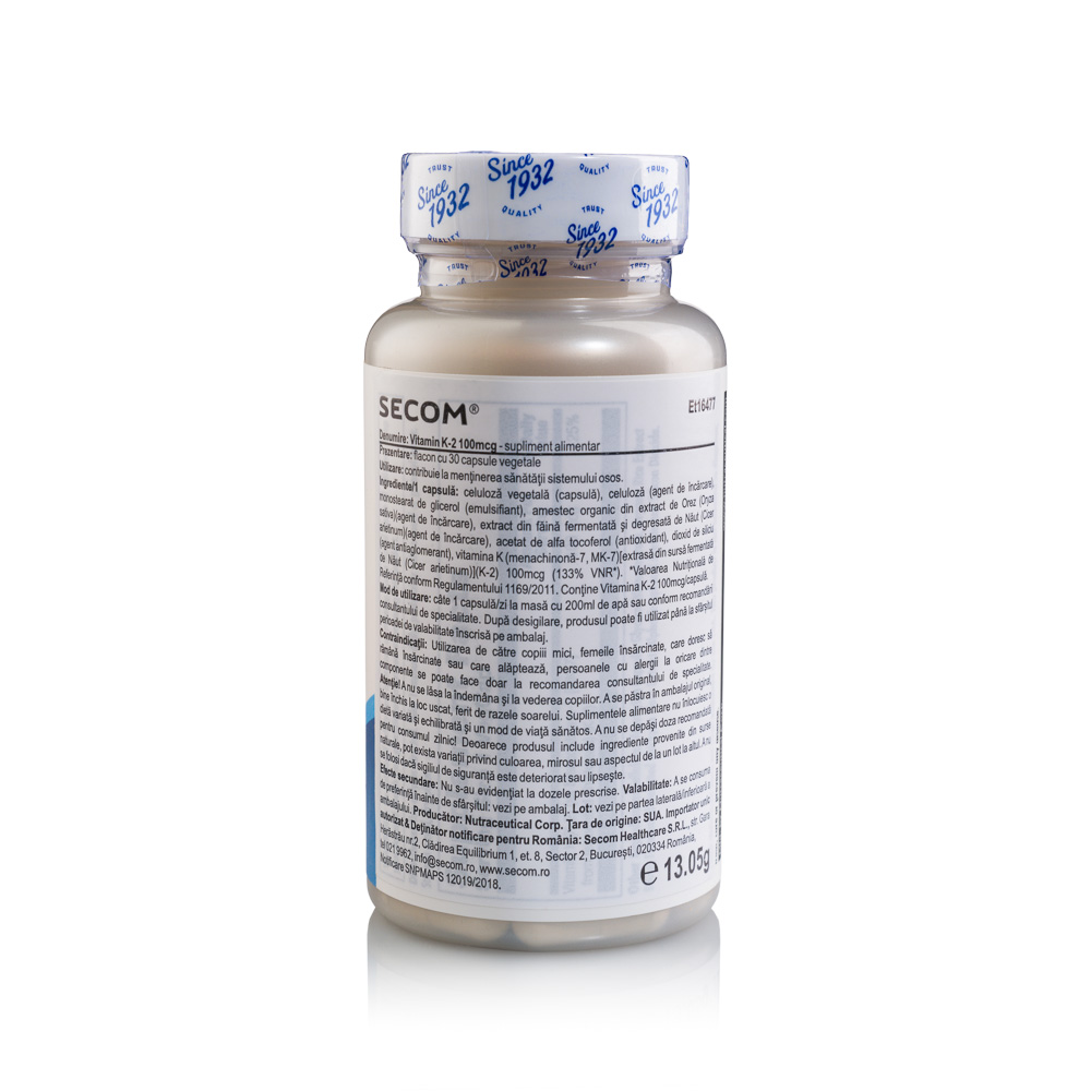 Ingrediente/1 capsula: Celuloza vegetala (capsula), c,eluloza (agent de incarcare), monostearat de glicerol (emulsifiant), amestec organic din extract de Orez (Oryza sativa)(agent de incarcare), extract din faina fermentata gi degresata de Naut (Cicer arietinum)(agent de incarcare), acetat de alfa tocoferol (antioxidant), dioxid de siliciu (agent antiaglomerant), vitamins K (menachinona-7, MK-7)[extrasa din sursa fermentata de Naut (Cicer arietinum)](K-2) 100mcg (133% VNR*). *Valoarea Nutritionala de Referinta conform Regulamentului 1169/2011. ContineVitamina K-2 100mcg/capsula.