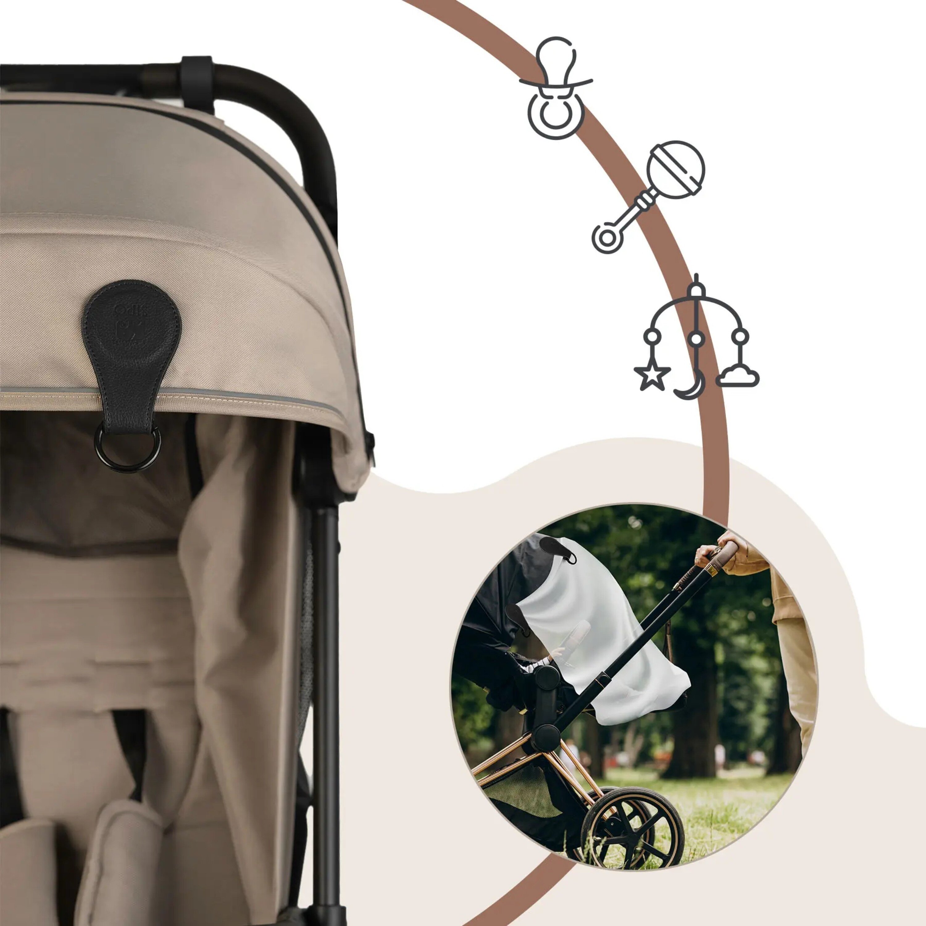 - Design elegant si modern, cu finisaj din PU leather maro care completeaza estetic orice carucior sau landou.