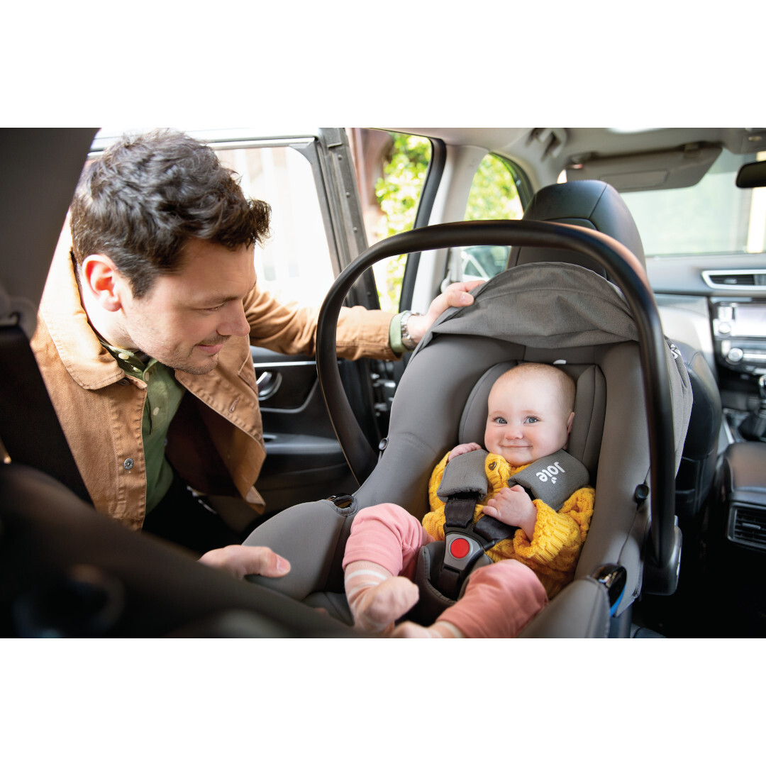 - Instalează scoica în mașină doar rear-facing (cu spatele la sensul de mers), folosind centura în 3 puncte sau una dintre bazele compatibile Joie (i-Base™, i-Base™ LX, i-Base™ Advance, i-Base™ Encore).