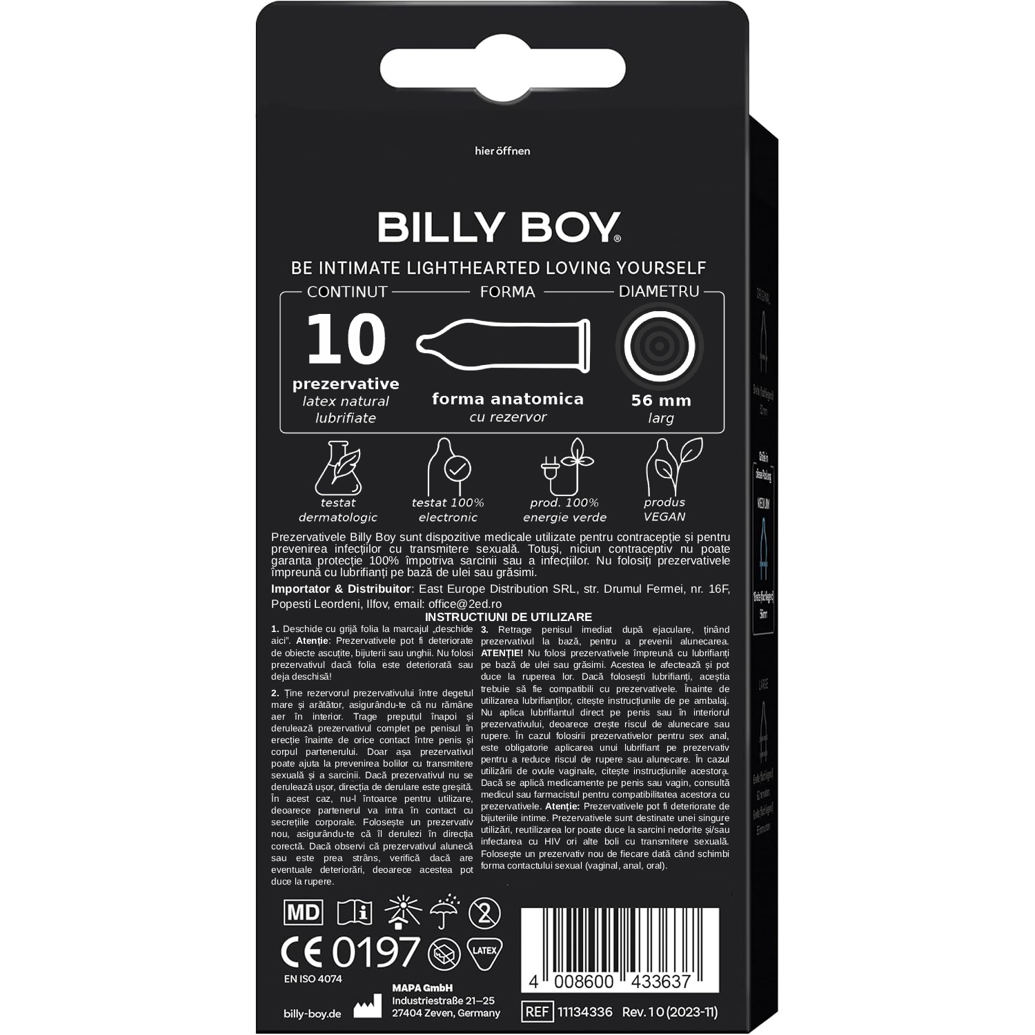 Prezervativele Billy Boy sunt vegane, prietenoase cu pielea si testate dermatologic. Fiecare prezervativ este verificat electronic individual pentru protectie maxima.