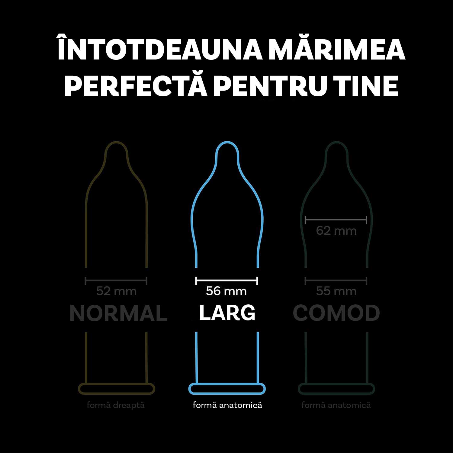 Realizate din latex natural, cu lubrifiant si rezervor, prezervativele au o latime nominala de 56 mm si grosime standard – pentru echilibrul ideal intre siguranta si senzatie.