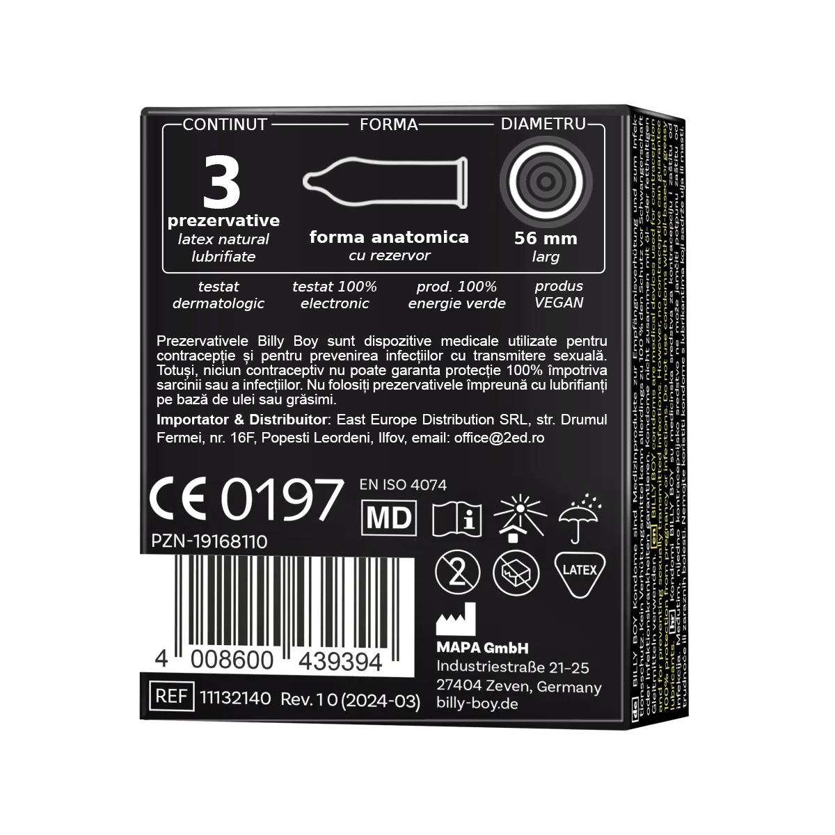 Prezervativele Billy Boy sunt vegane, prietenoase cu pielea si testate dermatologic. Fiecare prezervativ este verificat electronic individual pentru protectie maxima.