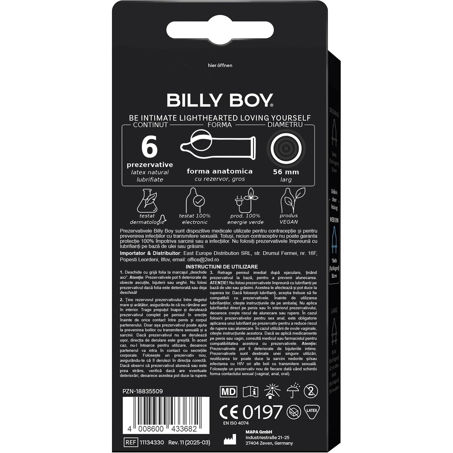 Prezervativele Billy Boy sunt dispozitive medicale utilizate pentru contracepție și pentru prevenirea infecțiilor cu transmitere sexuală. Totuși, niciun contraceptiv nu poate garanta protecție 100% împotriva sarcinii sau a infecțiilor. Nu folosiți prezervativele împreună cu lubrifianți pe bază de ulei sau grăsimi.