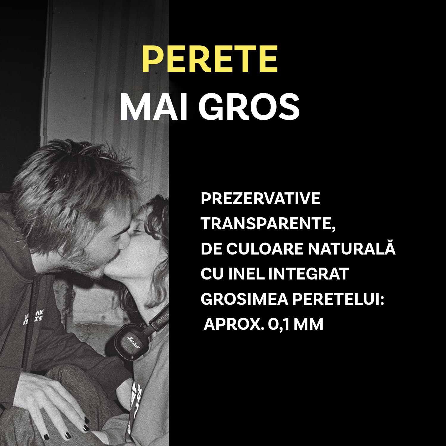 Fiecare cutie contine 6 prezervative transparente, mai groase, intr-o forma mai larga, de 56 mm.
