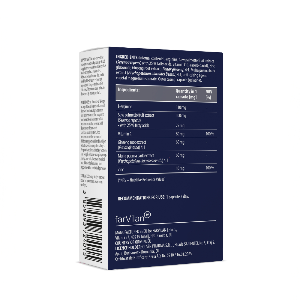 L-arginină; extract(CO2,12:1) din fructe de Palmier-pitic (Serenoarepens); capsula: gelatina, colorant / dioxid de titan; L-acid ascorbic; gluconate de zinc, extract hidroetanolic 4:1 din rădăcină de Ginsengcoreean (Panax ginseng); extract hidroetanolic 4:1 din scoartă de Muira puama (Ptychopetalum olacoides); agent antiaglomerant: stearate de magneziu; *Valoarea Nutritională de